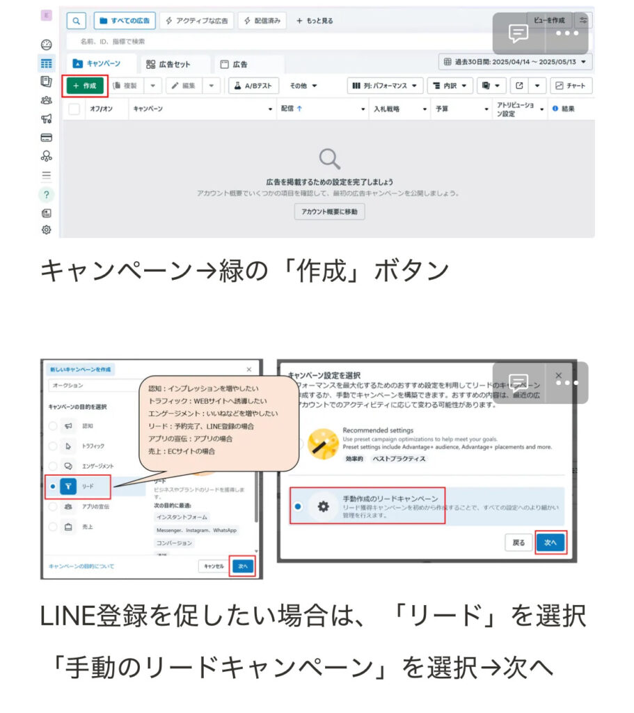 Meta広告で出稿する方法を、下記画像のように超具体的に画面キャプチャと一緒に解説。